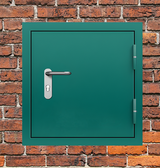 Профессиональное решение для обеспечения пожарной безопасности - люк металлический зеленый с блестящей ручкой с сертифицированными характеристиками надежности.