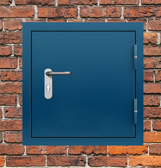 Профессиональное решение для обеспечения пожарной безопасности - люк металлический синий с блестящей ручкой с сертифицированными характеристиками надежности.