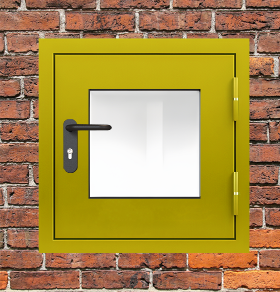 Профессиональное решение для обеспечения пожарной безопасности - люк металлический желтый с окном с сертифицированными характеристиками надежности.