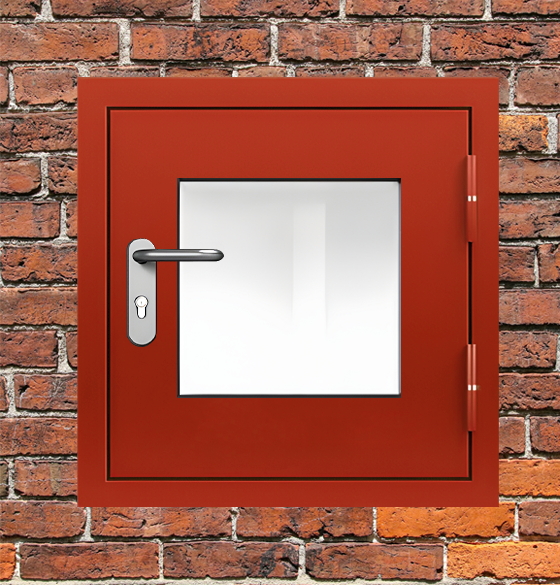 Специализированное решение люк металлический красный с окном и блестящей ручкой для комплексного обеспечения требований пожарной безопасности.