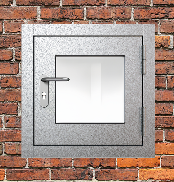 Профессиональное решение для обеспечения пожарной безопасности - люк металлический серый с окном и блестящей ручкой с сертифицированными характеристиками надежности.