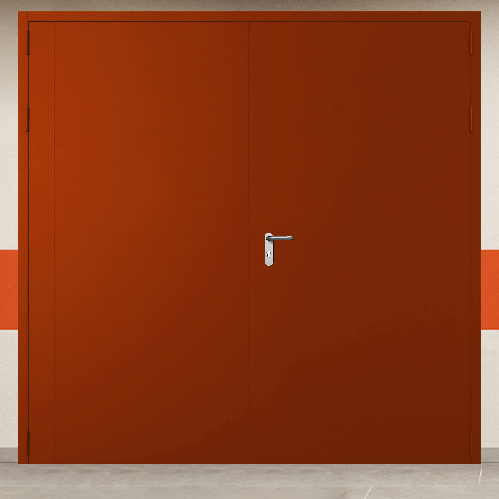 Высококачественное противопожарное оборудование - ворота металлические двустворчатые красные с блестящей ручкой без доводчика промышленного класса для систем защиты объектов.