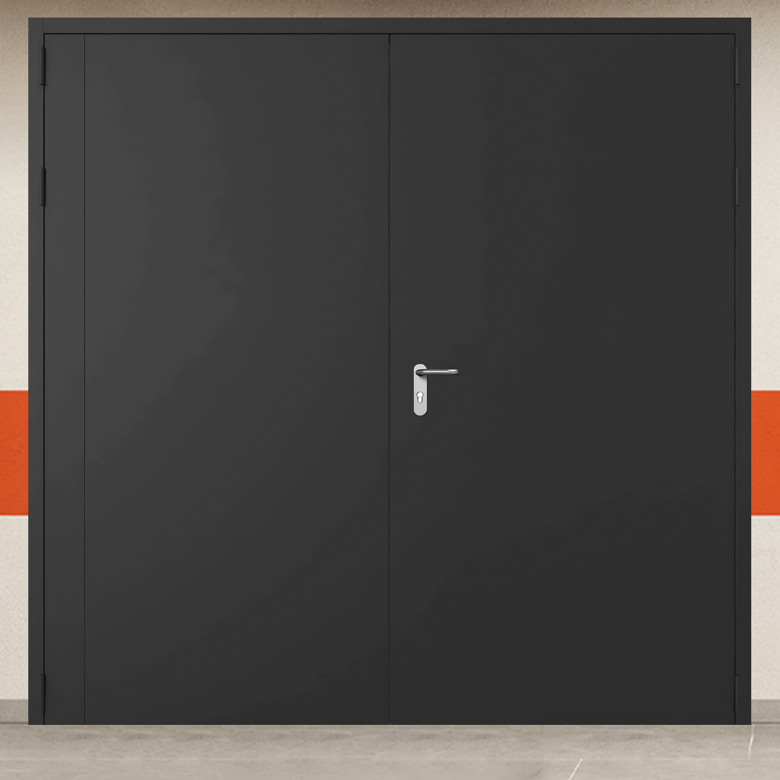 Высококачественное противопожарное оборудование - ворота металлические двустворчатые черные с блестящей ручкой без доводчика промышленного класса для систем защиты объектов.