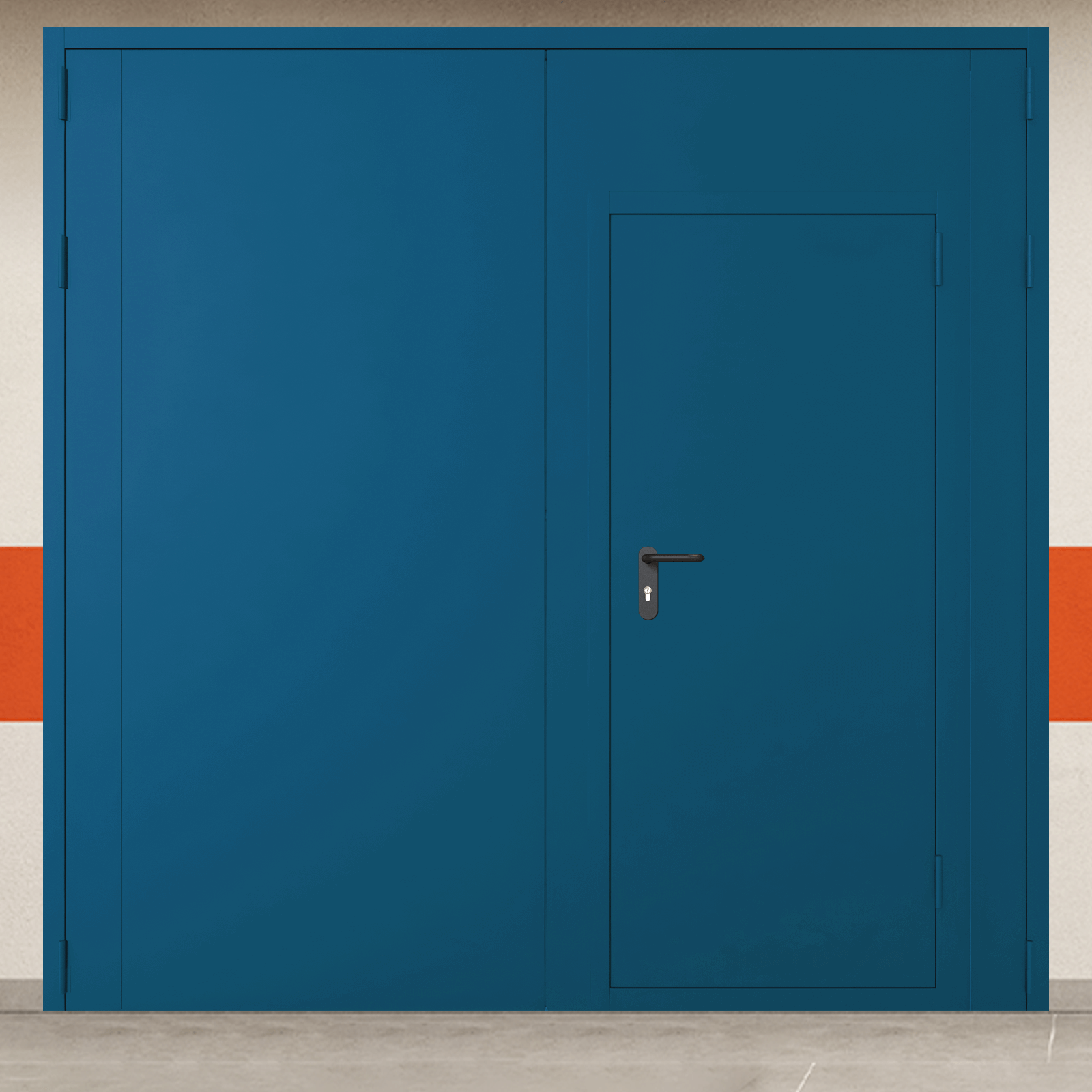 Специализированное решение ворота металлические двустворчатые синие с дверью без доводчика для комплексного обеспечения требований пожарной безопасности.