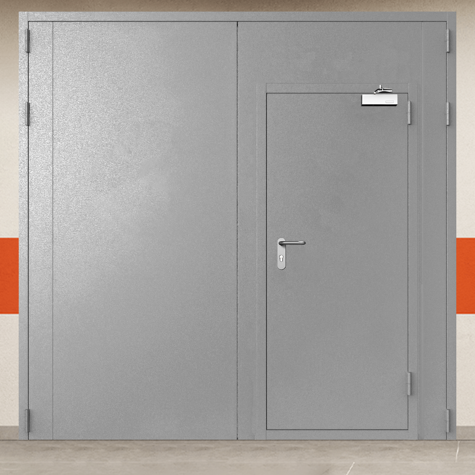 Профессиональное решение для обеспечения пожарной безопасности - ворота металлические двустворчатые серые с дверью, блестящей ручкой с сертифицированными характеристиками надежности.