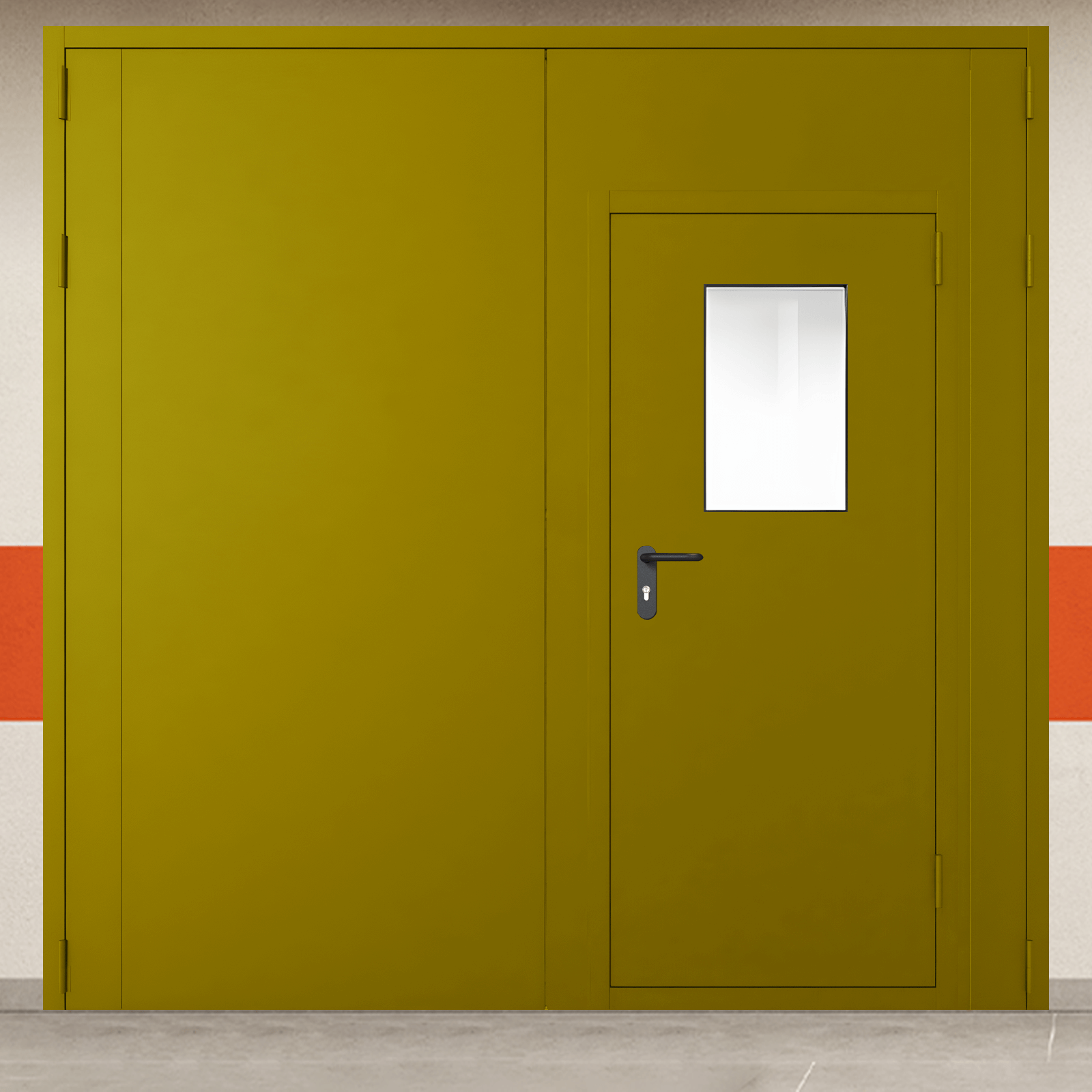 Высококачественное противопожарное оборудование - ворота металлические двустворчатые желтые с дверью и окном, промышленного класса для систем защиты объектов.