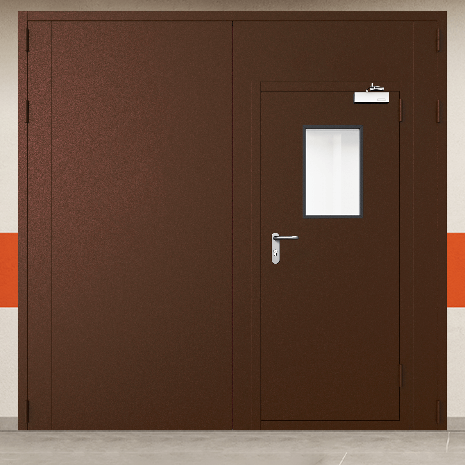 Высококачественное противопожарное оборудование - ворота металлические двустворчатые черные с блестящей ручкой и доводчиком промышленного класса для систем защиты объектов.