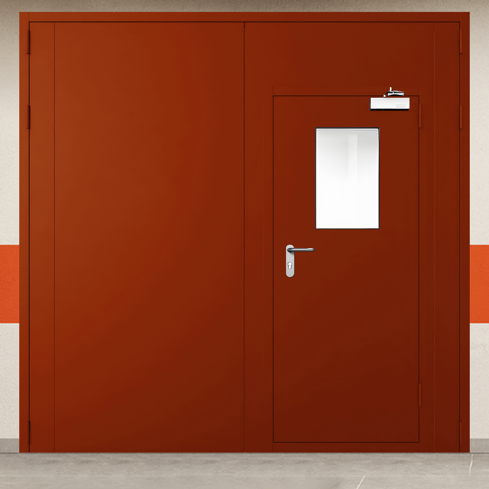 Профессиональное решение для обеспечения пожарной безопасности - ворота металлические двустворчатые красные с двумя окнами, блестящей ручкой с сертифицированными характеристиками надежности.