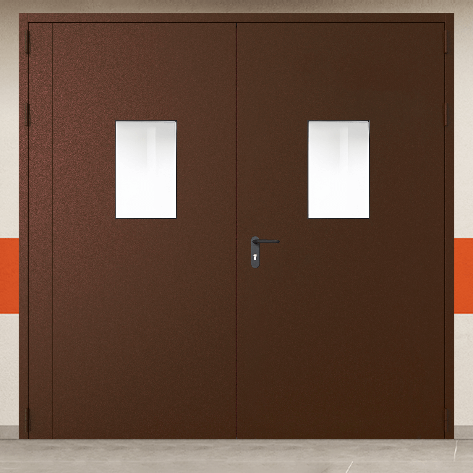 Специализированное решение ворота металлические двустворчатые коричневые с двумя окнами для комплексного обеспечения требований пожарной безопасности.