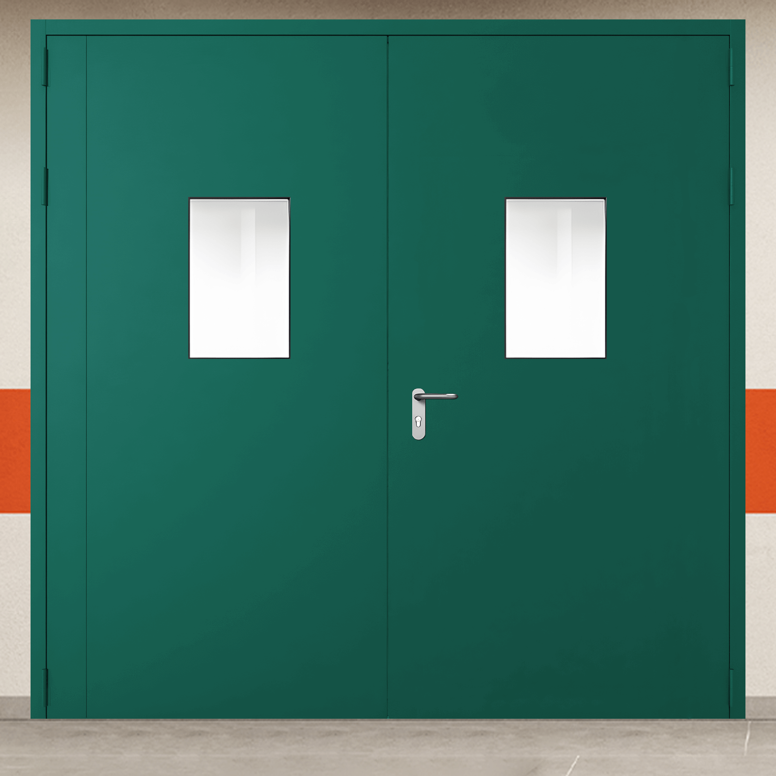 Специализированное решение ворота металлические двустворчатые зеленые с двумя окнами, блестящей ручкой для комплексного обеспечения требований пожарной безопасности.