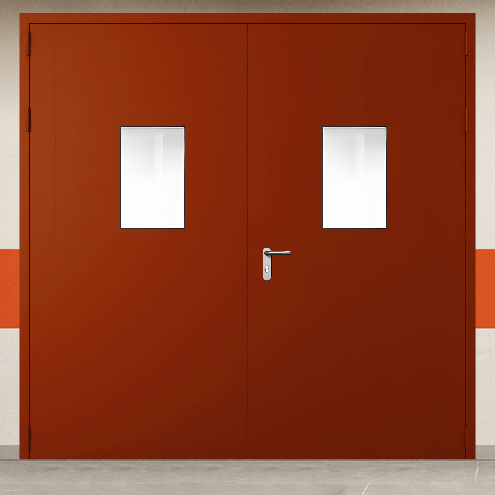 Высококачественное противопожарное оборудование - ворота металлические двустворчатые красные с двумя окнами, блестящей ручкой промышленного класса для систем защиты объектов.